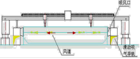 在切割平臺(tái)兩側(cè)安裝方形吸風(fēng)道,吸風(fēng)道上方裝有一個(gè)可隨切割機(jī)一起移動(dòng)的滑動(dòng)吸風(fēng)小車(每個(gè)切割機(jī)兩個(gè))。滑動(dòng)吸風(fēng)小車、切割頭、安裝在切割機(jī)沿橫梁方向的同一直線上。利用切割平臺(tái)上的格柵板與被切割鋼板形成煙氣通道,切割鋼板時(shí),產(chǎn)生的切割煙塵通過(guò)該煙氣通道由風(fēng)機(jī)負(fù)壓作用流向滑動(dòng)小車吸風(fēng)口,進(jìn)入方形吸風(fēng)道,最后進(jìn)入凈化器主機(jī)進(jìn)行切割煙塵凈化處理。
