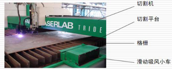 在切割平臺一側安裝方形吸風道,吸風道上方裝有一個可隨切割機一起移動的吸風小車,并在切割平臺的另一側裝有吹風風機。滑動吸風小車切割頭吹風風機安裝在切割機沿衡量方向的同一直線上。利用切割平臺上的格柵板與切割鋼板形成“煙氣通道”。切割鋼板時,吹風風機將產生的切割煙塵通過“煙氣通道”吹向吸風小車吸風口,進入方形吸氣風道,最后進入凈化器主機進行切割煙塵凈化處理